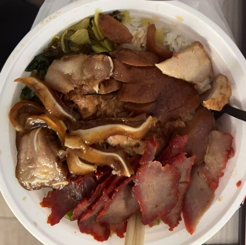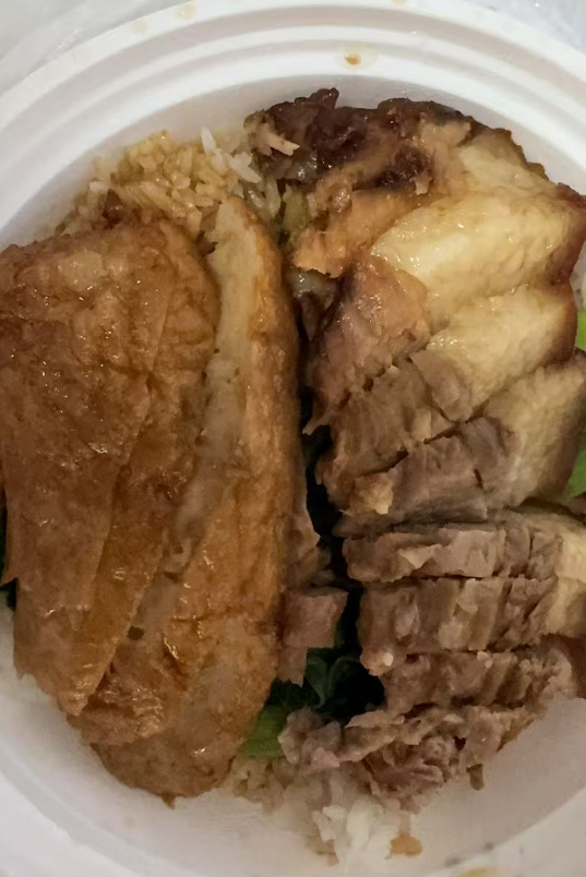 预制菜猪脚饭,这个肉一点味道没有(感觉冰箱里冻了几年),肉卷也是咸的要命
