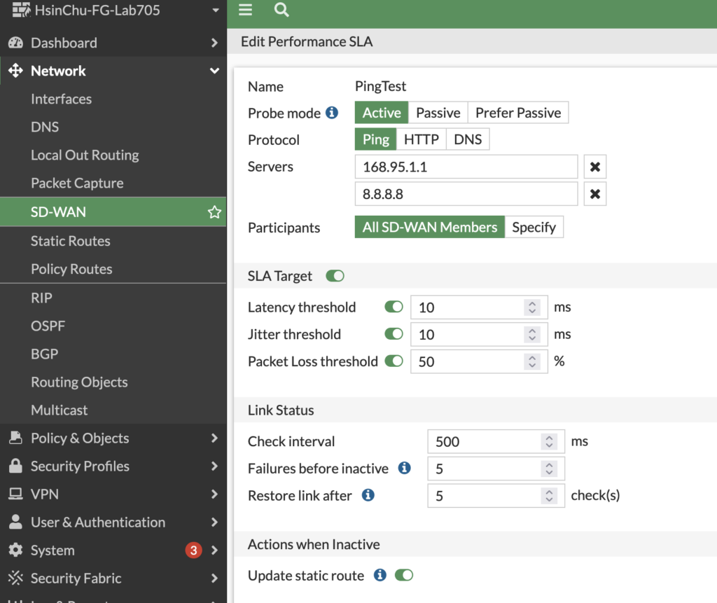 SLA参数(例如:PingTest) - 设定质量判断标准(例如:以