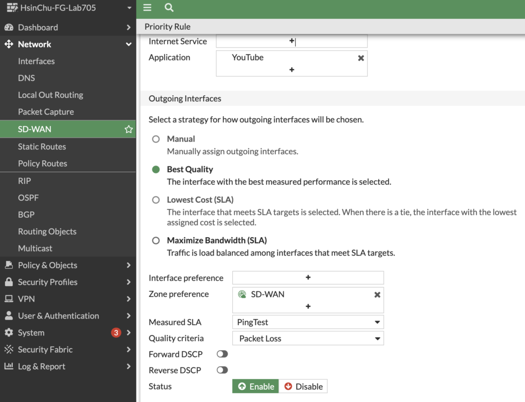 SD-WAN算法(例如:Best Quality- 使用质量最佳的线路) - 指定测量的